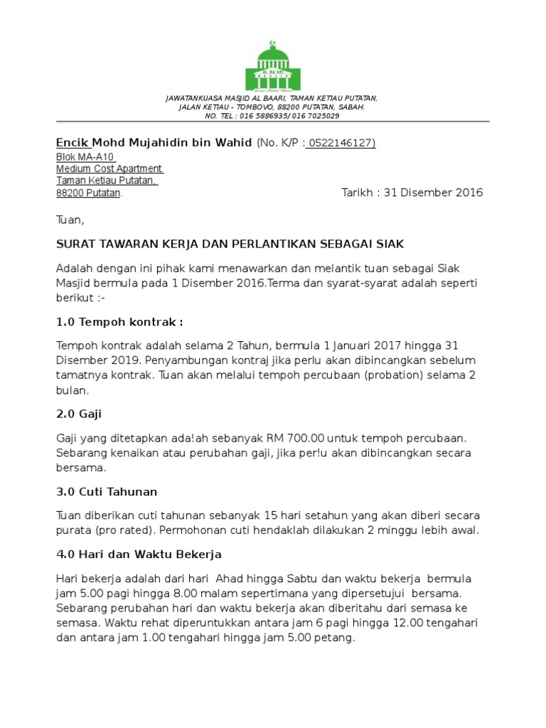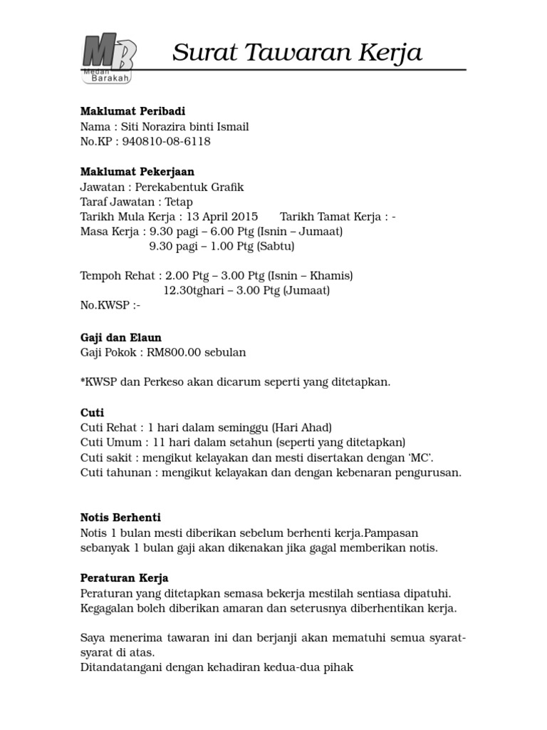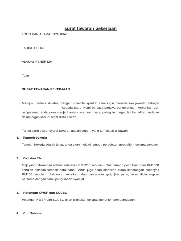 Contoh surat pelantikan tawaran kerja. Walaupun meraka menawarkan pekerjaan samada terus dari telefonsurat tawaran kerja adalah satu kemestian yang harus ada apabila sesebuah sayikat mula mengaji. Surat perjanjian kontrak kerja semua perusahaan pada dasarnya sama karena di Indonesia sendiri segala sesuatu yang berhubungan dengan tenaga kerja dan karyawan sudah diatur dalam undang-undang agar dapat menjamin setiap orang dapat mendapatkan hak nya masing-masing.